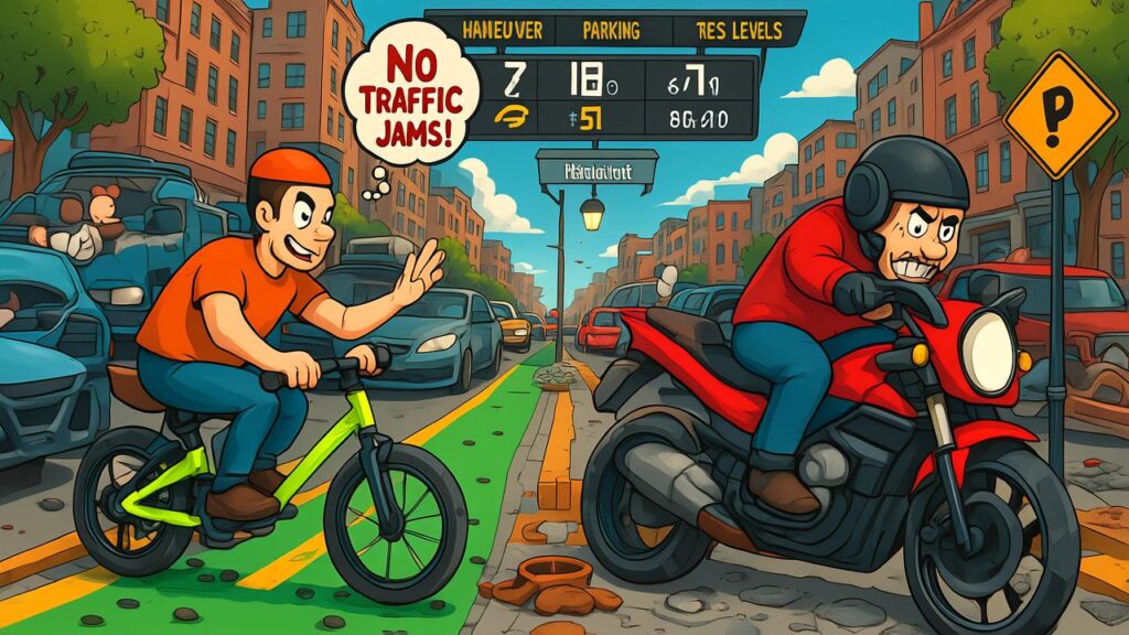 Cities throw everything at you—rain, potholes, and traffic. E-bikes leave you more exposed to weather, so rain or snow can be a drag unless you’ve got good gear. Motorcycles offer better weather protection, but you’re still not in a cozy car. Infrastructure-wise, cities with bike lanes favor e-bikes, letting you avoid traffic altogether. Motorcycles rely on roads, which can mean more congestion and stress.